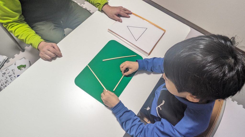 書くことへの支援プログラムの1つです。棒をお手本と同じように三角形やひし型に並べることができたら、次は鉛筆で図形を模写する段階に入ります。次第にかな文字を書く段階につなげていきます。最初は縦・横はわかっても、斜めは難しい傾向にあります。