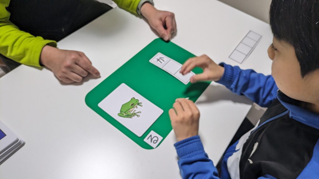 大人でも「檸檬」や「麒麟」などは、読めても書ける人は少ないと思います。字を見ただけで読めてしまうのです。前後を逆にした「檬檸」や「麟麒」でもレモン・キリンと読みそうですよね。字の構成や並びなど実はあまり気にしていないという事です。こどもは言葉の獲得段階で、単語をひと塊で覚えている時期があります。「るえか」や「かるえ」でも🐸という認識です。プログラムを通して、かえるは3文字で、「か・え・る」という順番だと覚えていきます。この過程は表現力を身に着けたり、コミュニケーション能力や社会性を養ってく上でとても大切になります。